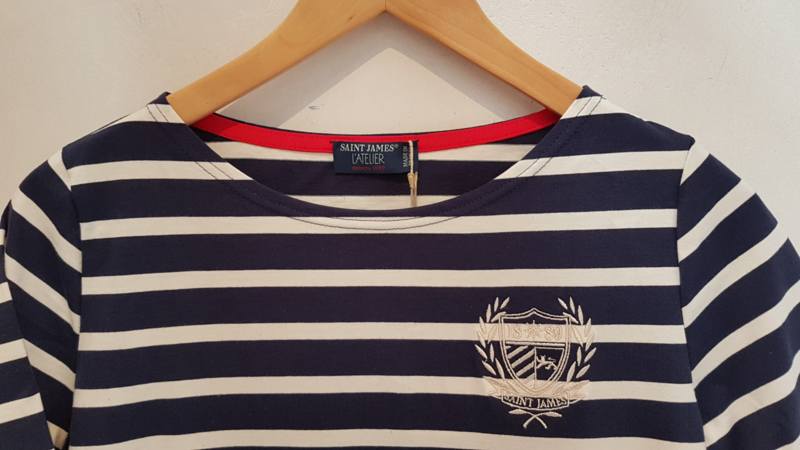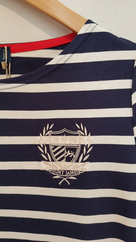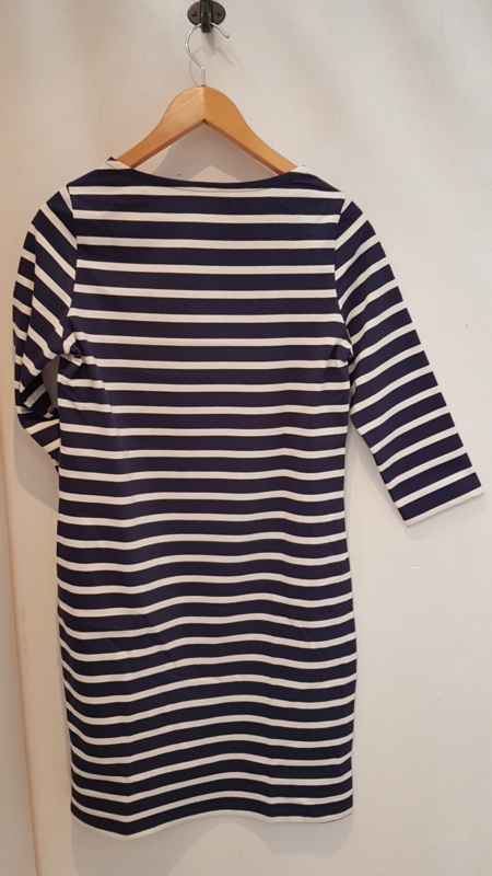 OverzichtGestreepte jersey jurk. 3/4 mouwen. Geborduurd embleem op de borst. Rode biaisband in de halslijn.