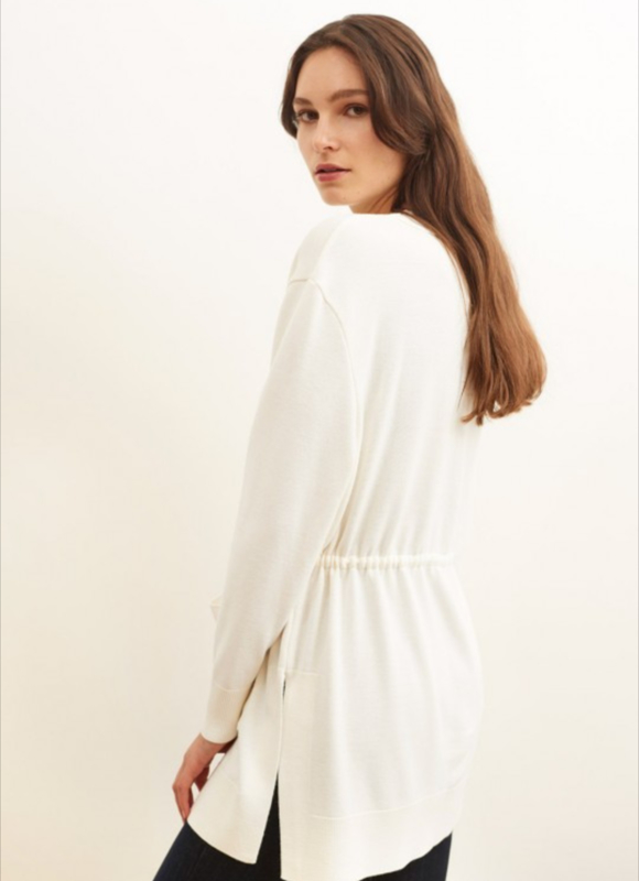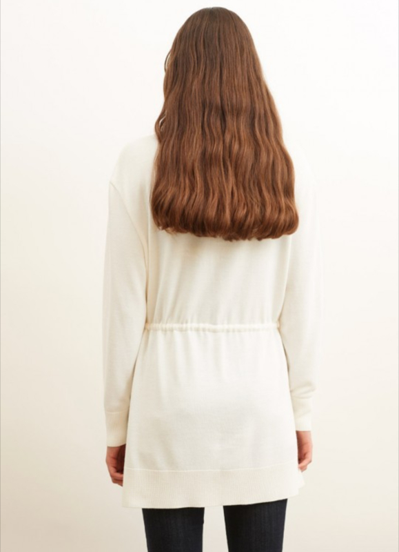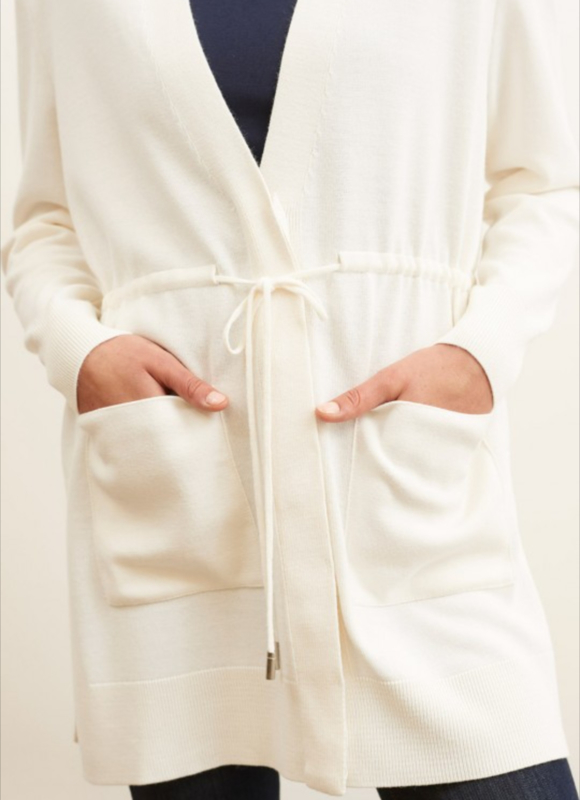 OverzichtEen jack van fijngebreid tricot met een trekkoord in de taille. Verborgen knoopsluiting. Grote opgestikte zakken aan de voorzijde. Splitjes aan de zijkanten. Brede ribboord aan zoom en manchetten.