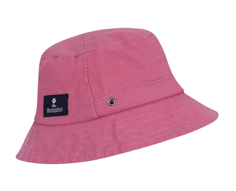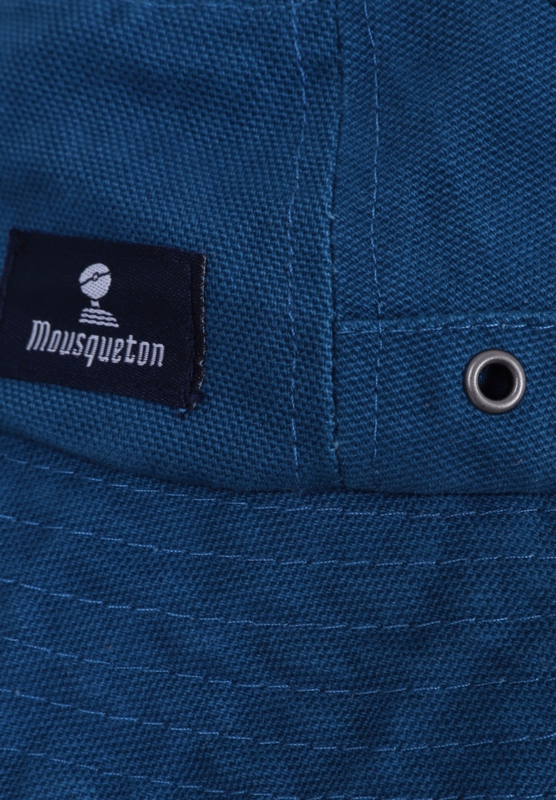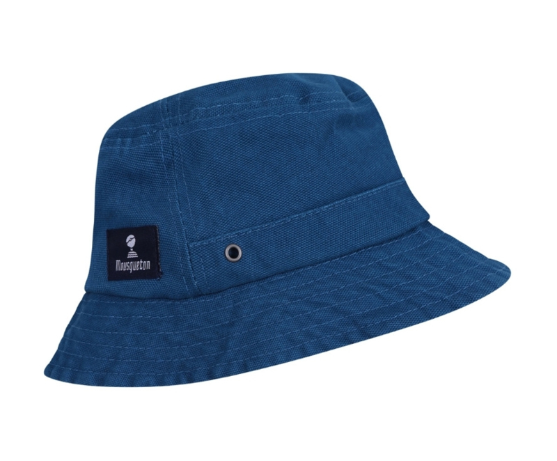 Stoffen vissershoed voor kinderen met doorgestikte randen en ventilatiegaatjes. Mousquetonlogo aan de achterkant.