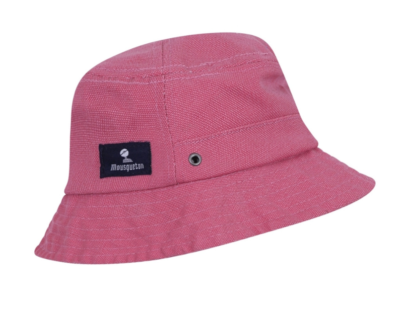 OverzichtStoffen vissershoed voor kinderen met doorgestikte randen en ventilatiegaatjes. Mousquetonlogo aan de achterkant. Bevestiginskoord om onder de kin te binden.