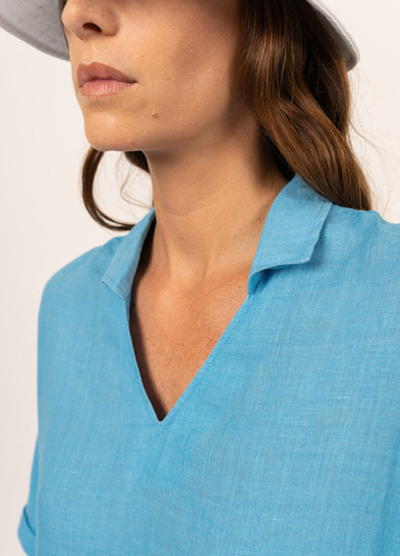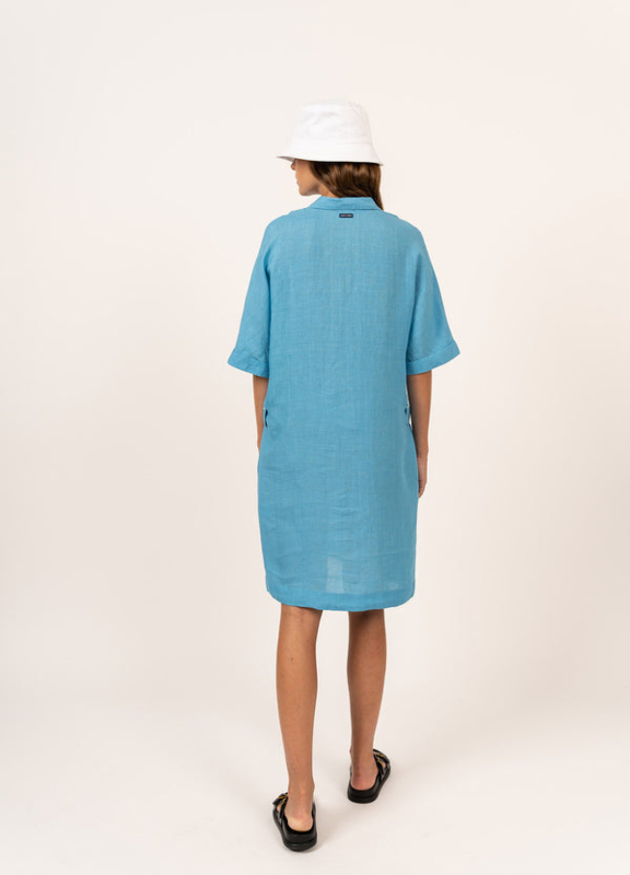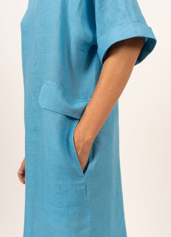 De Marine-jurk is een linnen jurk, met een rechte en verfijnde snit. De V-hals geeft het geheel een vrouwelijke en chique touch, geaccentueerd door de open kraag in overhemdstijl. In de taille sluiten twee klepzakken dit luchtige en vloeiende zomerstuk mooi af.