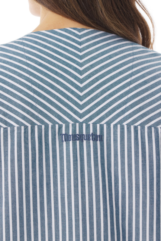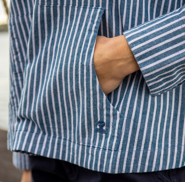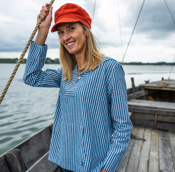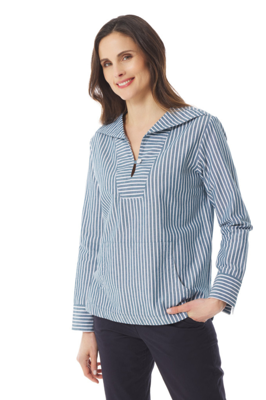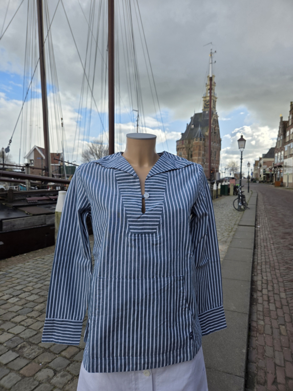 Deze gestreepte chambrayblouse zet de nautische stijl weer in de kijker! Uitgerust met een matrozenkraag geïnspireerd op een erwtenjas, zal hij je vergezellen in de stad of aan zee. Het is een lichte blouse ontworpen in een zachte en ademende chambray, waardoor hij een tijdloze gemêleerde look krijgt.