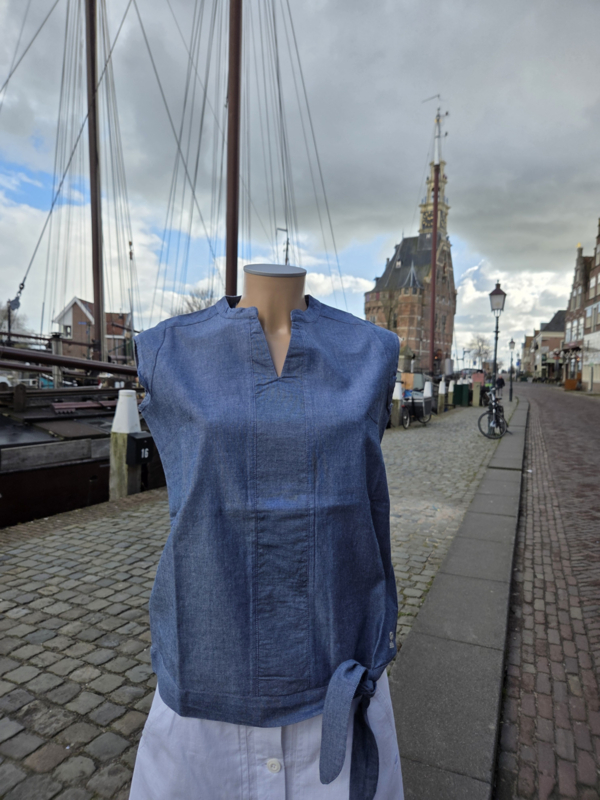Beschrijving : Chambrayblouse voor dames met korte mouwen.
