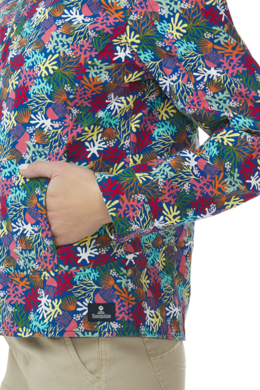 Het Fiona-tussenseizoenjack is een van de bestsellers van het merk en is hier verkrijgbaar in de licht vervaagde "print"-versie. Dit jack met capuchon en zeer vrouwelijke uitsparingen is ideaal voor het tussenseizoen. Dankzij het dikke canvas, de capuchon en de afdekkende kraag met drukknopen blijf je beschermd tegen de wind. Wij zijn dol op de voering met motief, die verwijst naar de kust.